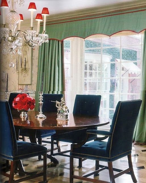 With its red and green, this lovely dining room is ready for Christmas and all year long. Classic Chinoiserie wallpaper and furniture are given a modern touch with the unexpected navy blue dining chairs. Another modern look is no rug - a trend in the dining room that I really like. The green curtains are trimmed and tasseled in red. Other red touches include the red chandelier shades - very Alessandra Branca and red flowers.